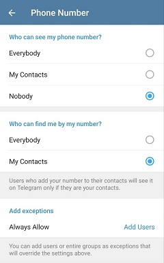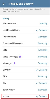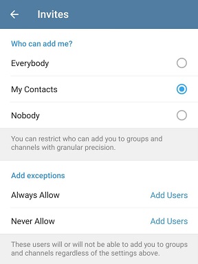 Telegram дозволяє налаштувати, хто має право додавати вас у групи та канали.