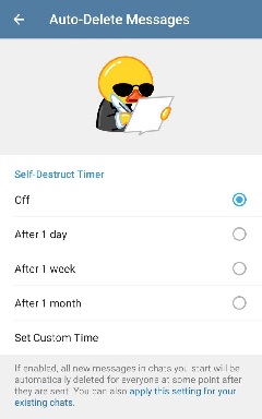 Ця функція не замінює секретні чати, а доповнює їх, дозволяючи налаштувати автоматичне видалення повідомлень у чатах за таймером. Після прочитання або через заданий час повідомлення зникають у вас і у співрозмовника без можливості відновлення. Таймер можна змінити або вимкнути коли завгодно.