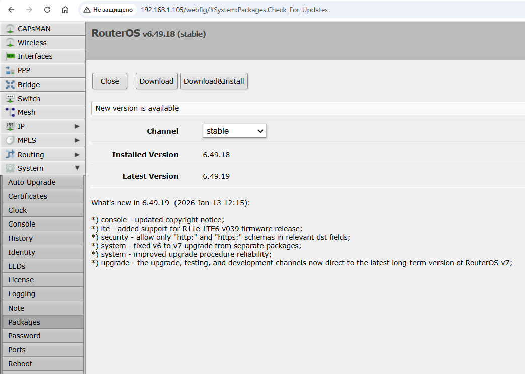 What to do: check for updates at least every few months. If your router supports automatic updates, enable it. On MikroTik routers, this is done via the System → Packages → Check for Updates menu.