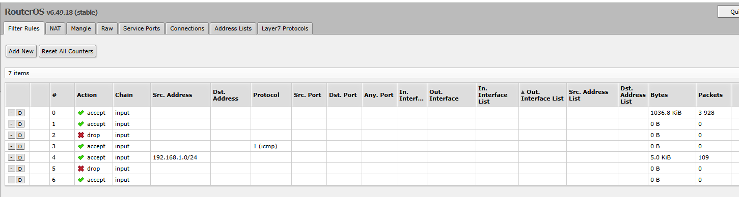 Important: MikroTik firewall rules are executed sequentially, so their order matters. Before making any changes to the firewall, back up the configuration (Files → Backup or /export in the terminal).