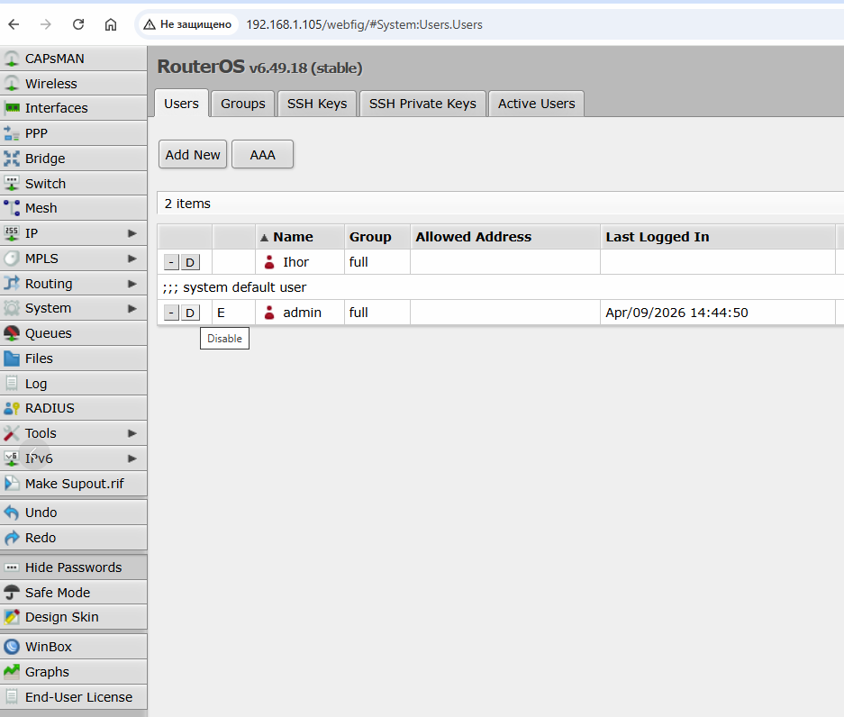 What to do: disable or delete the default «admin» account and create a new one with a unique username and a strong password. Avoid common names like «user», «guest», or «administrator». On MikroTik routers, this can be done via System → Users. When changing the password on your router, keep in mind that it must contain uppercase and lowercase letters, numbers, and special characters, be at least 8 characters long, and not match the username or passwords for other services.