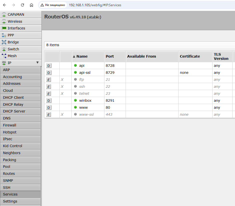 What to do: on the MikroTik, go to IP → Services and disable or restrict access to services you don't use. For each active service, specify allowed IP addresses in the «Available From» field so that access is limited to your network or a specific address. Telnet, as an outdated and insecure protocol, should be disabled completely.