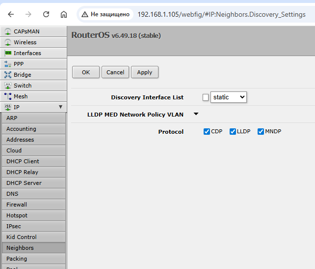 This is an important step that helps protect your Wi-Fi router from your neighbors. MikroTik uses MNDP (MikroTik Neighbor Discovery Protocol), a neighbor discovery protocol that allows routers to automatically find and exchange information with each other. The problem is that this protocol broadcasts the router's operating system version and a list of active features. This is essentially a ready-made «business card» for an attacker: knowing the RouterOS version, they can exploit the corresponding known vulnerabilities.